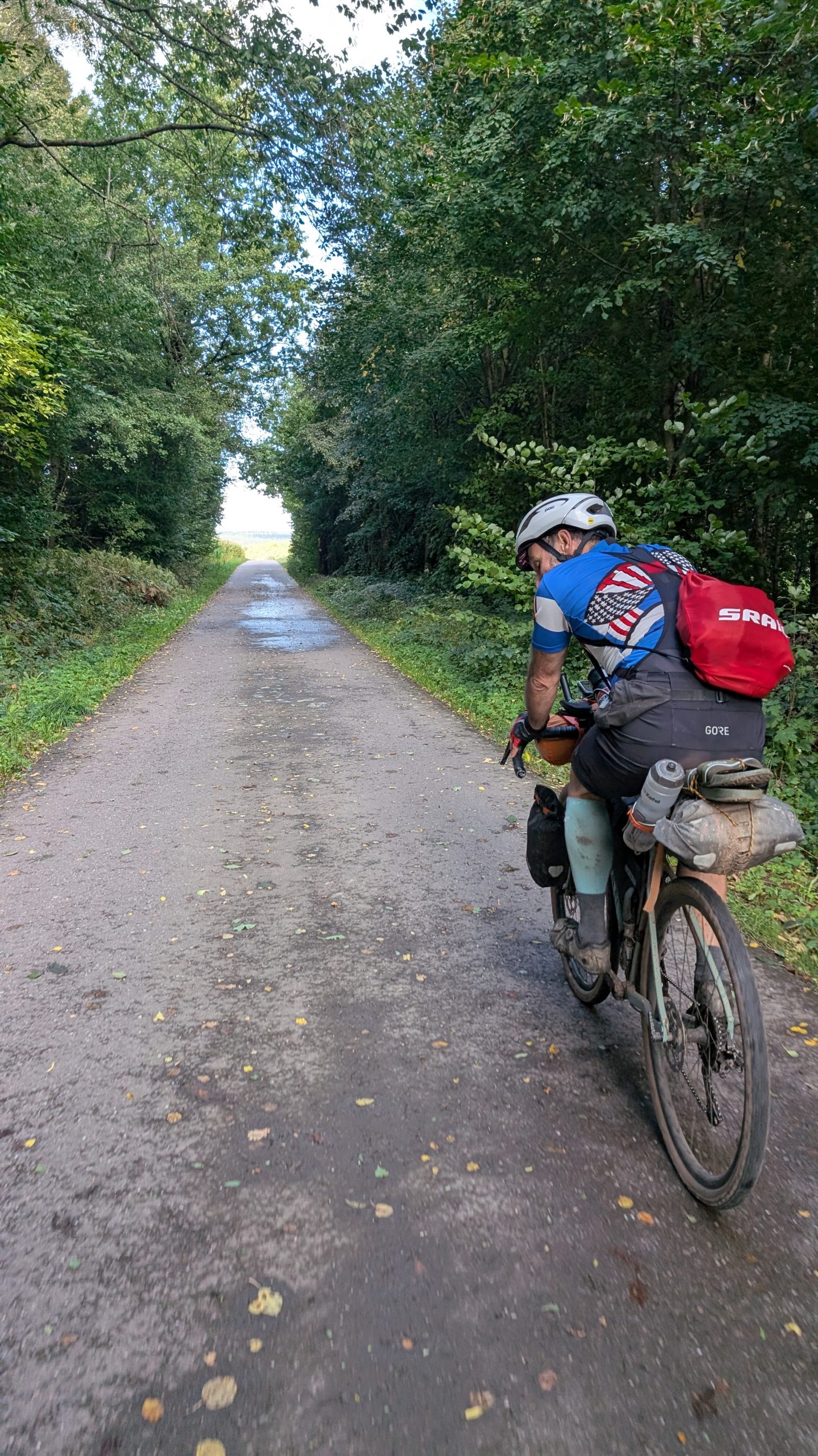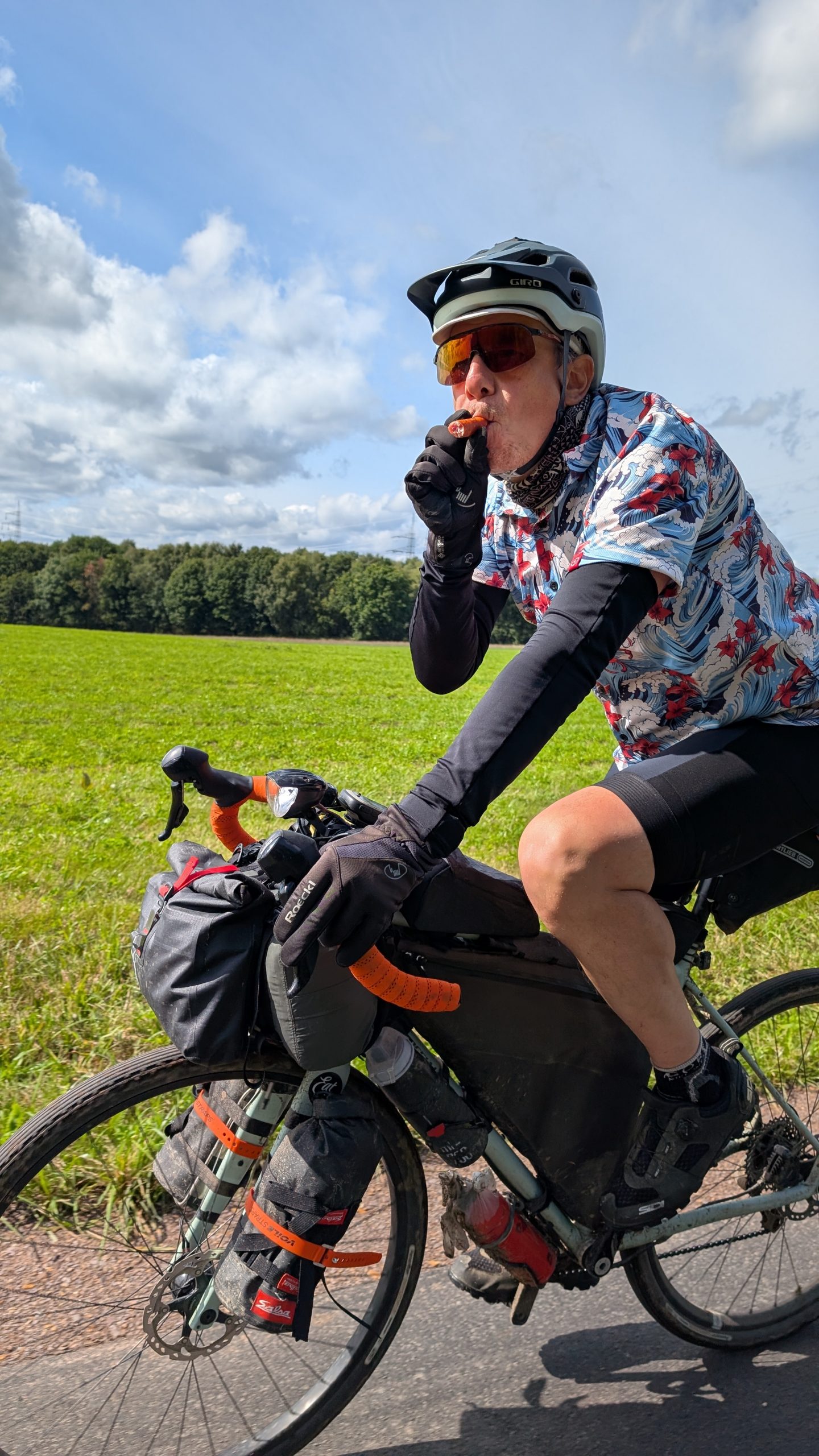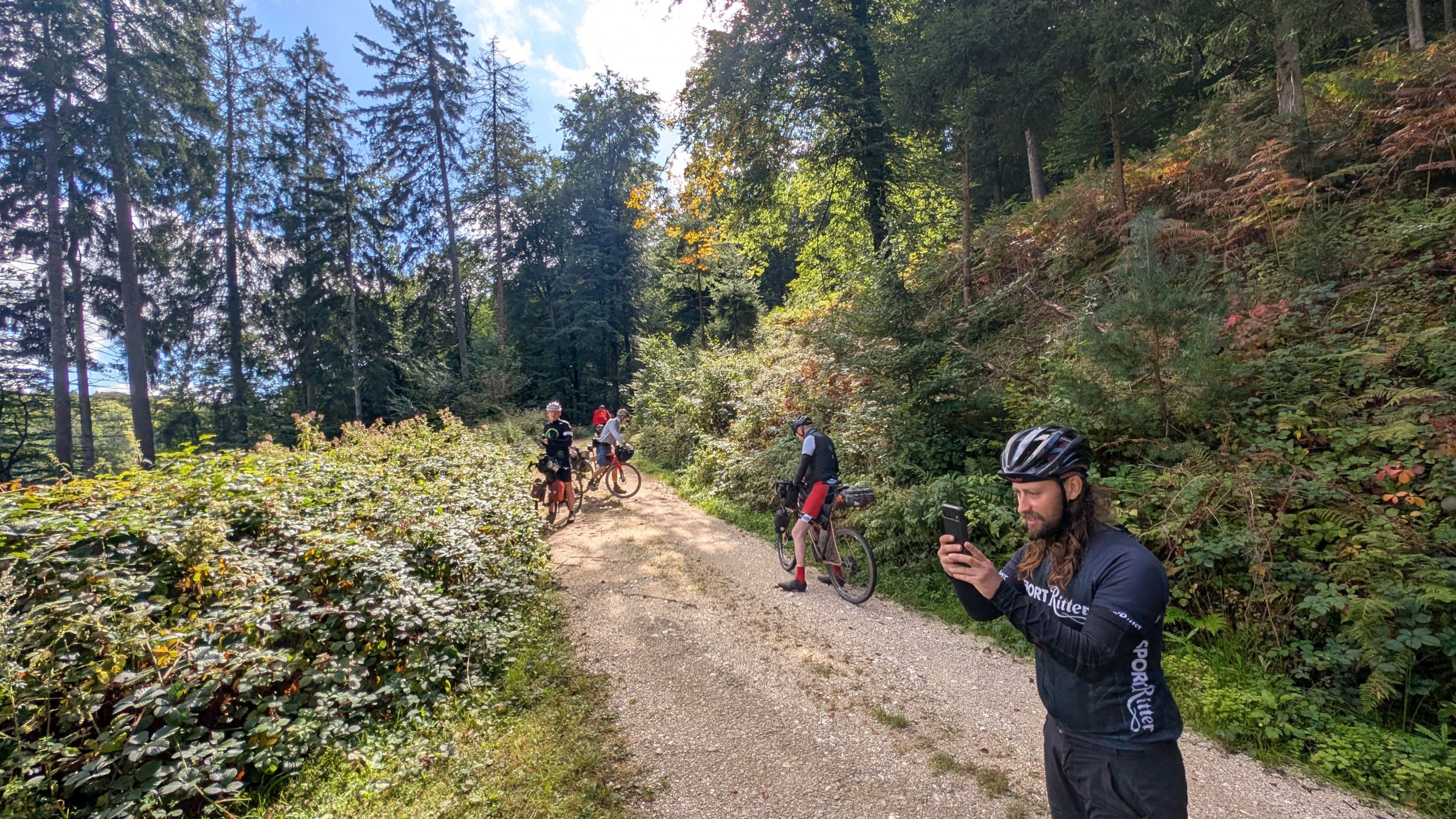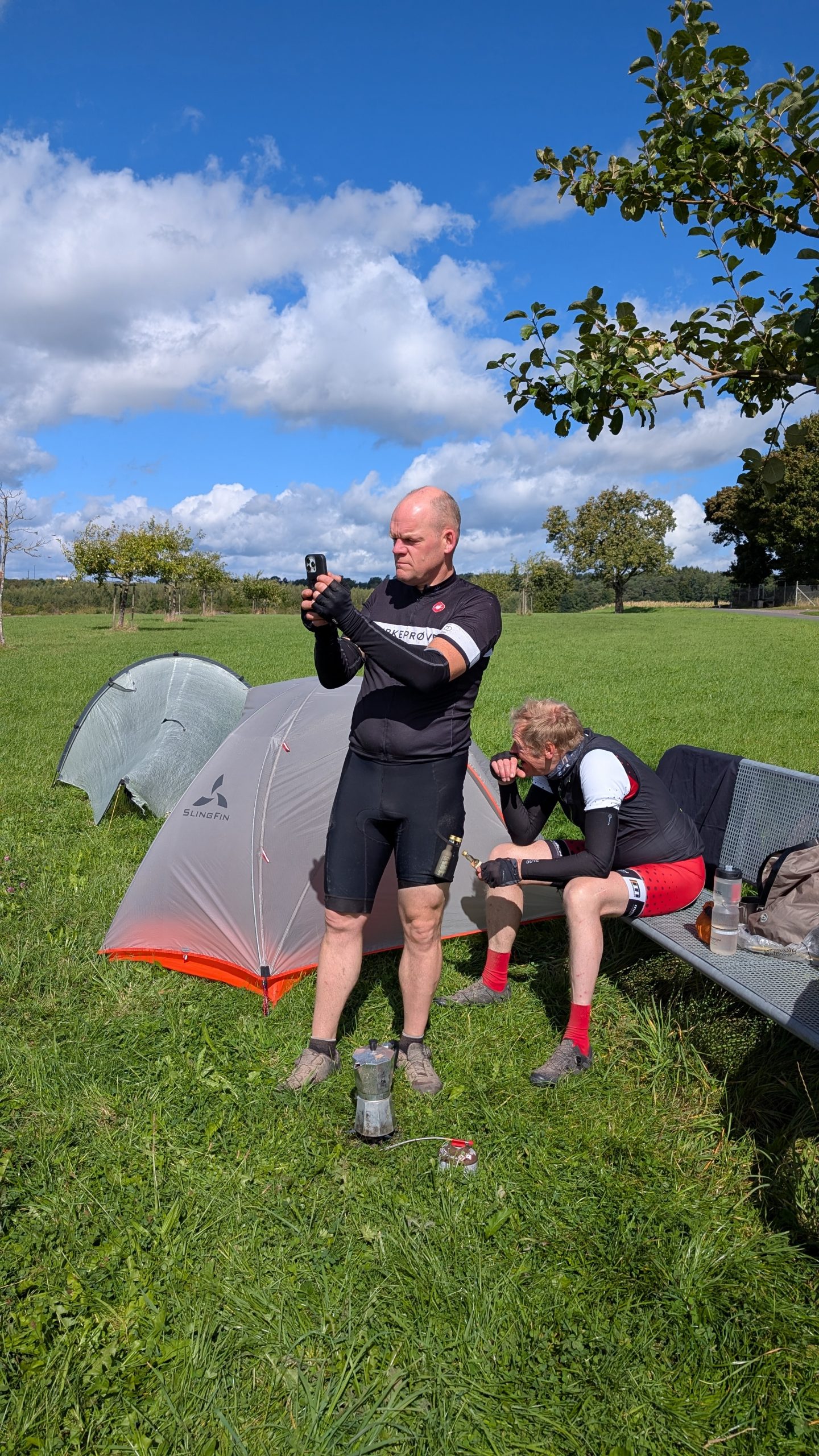 The start of the second day was with a flat tire of Holger and the switch to tubeless, on the track. Team work helped to manage it fast. It was the day of the other Thomas. He first implemented a kloster bakery with local food and drinks as his first challenge. Well done ☑️